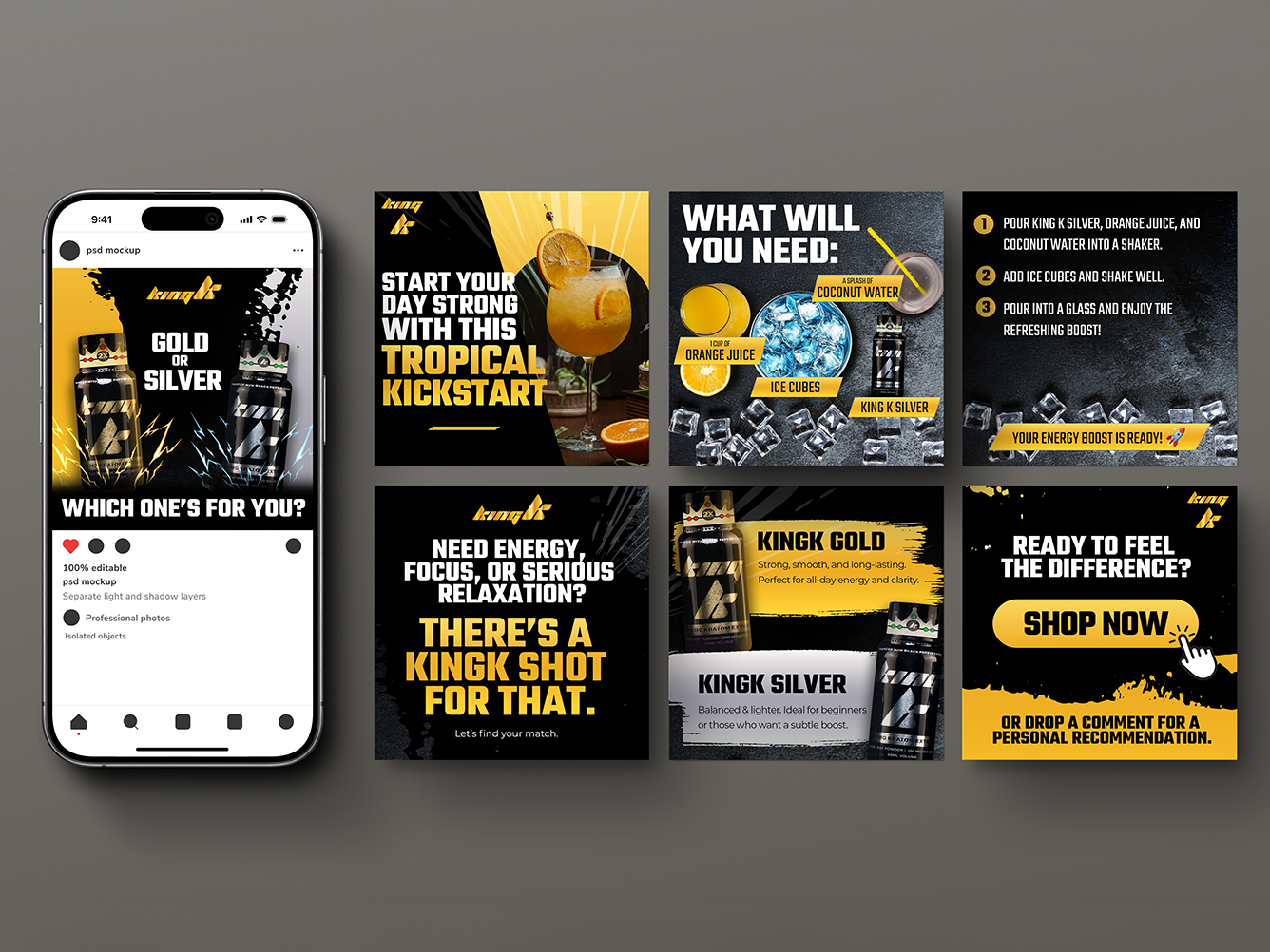 During my collaboration with Empowered Solutions, I've build many visuals to promote one of their most popular product lines - King K kratom extract which, at the time, consisted of 2 existing product: Gold and Silver.