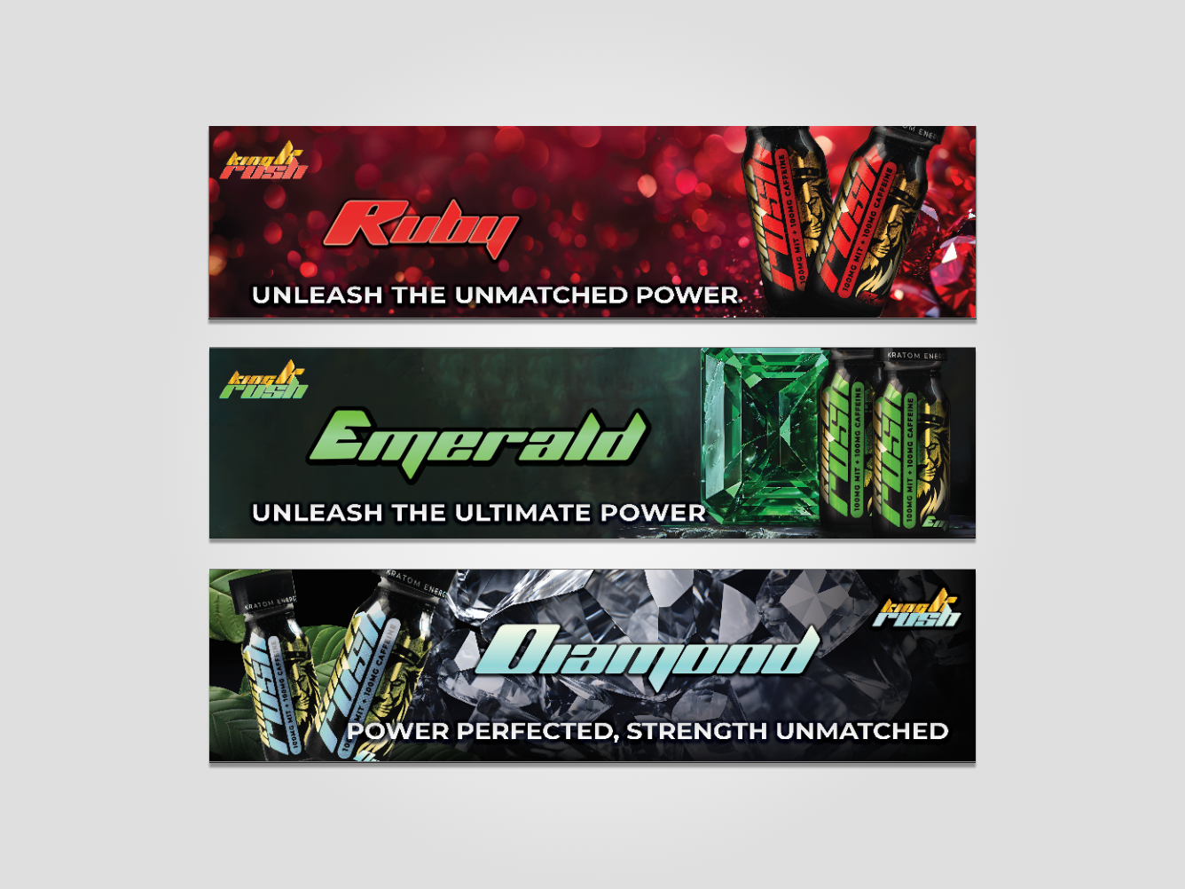 In 2024, I helped develop a new product line under the King K brand. King K Rush is a kratom-based energy drink available in three flavors, each named after a gemstone and paired with a corresponding theme color - Ruby, Emerald, and Diamond. This approach reinforces the royal aesthetic of the existing King K branding.